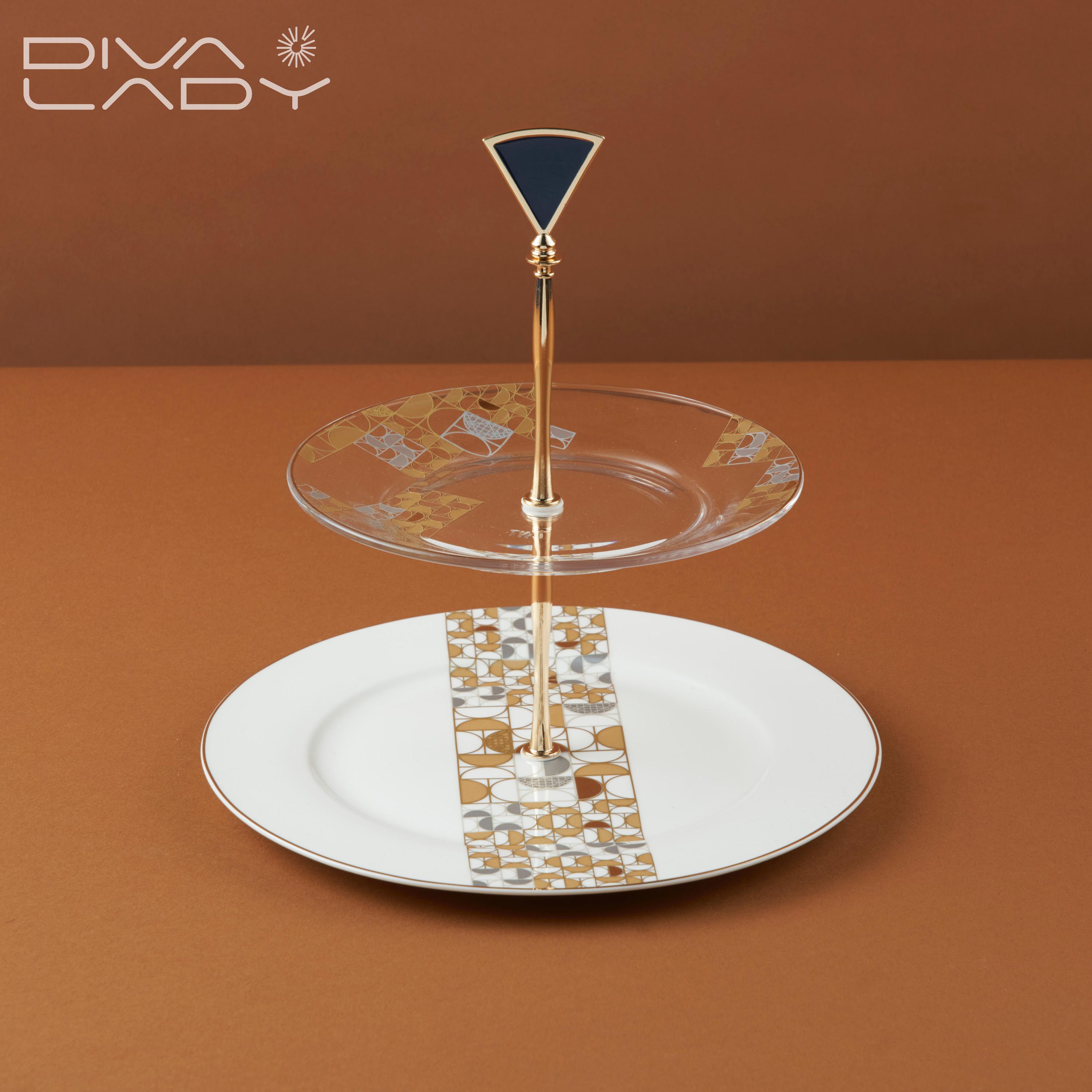 قطعة أنيقة وعملية مصممة لعرض الحلويات والوجبات الخفيفة بطريقة جذابة يتكون من طبقتين دائريتين مثبتتين على عمود معدني ذهبي تتميز الطبق العلوي بتصميم بسيط وأنيق مصنوع من الزجاج العالى الجودة  بينما تتميز الطبق السفلية بنقشة أنيقة