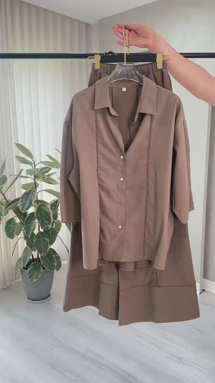 التصميم يتألف من قميص بأكمام واسعة وقصة فضفاضة، مع أزرار أمامية وجيوب على الصدر، وبنطال بقصة واسعة جداً ومنسدلة يضمن أقصى درجات الراحة وحرية الحركة. الخامة مصنوع بالكامل من خامة "اللين" (الكتان) الصيفي الممتاز بنسبة 100%، وهي مادة طبيعية عالية الجودة توفر مستويات قصوى من التهوية والعملية. المزايا القطعتان يمكن تنسيقهما معاً لإطلالة متجانسة، أو بشكل منفصل، ويُعد الطقم إضافة ضرورية إلى خزانة ملابسك الأساسية تعكس اختياراتك الراقية والفريدة.