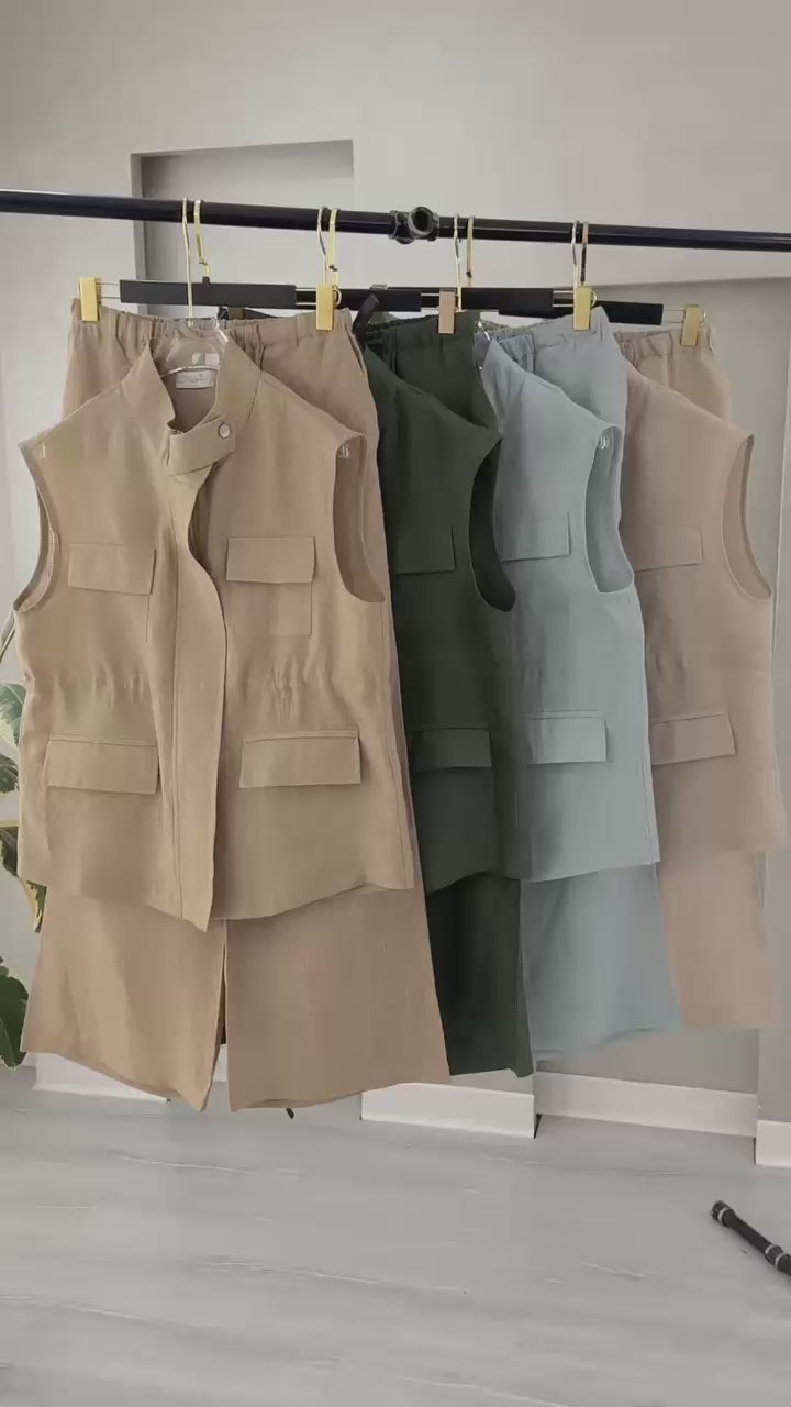 الإطلالة تتكوّن من فيست بلا أكمام بتصميم عملي، يحتوي على جيوب أمامية كبيرة تضيف طابعًا وظيفيًا واضحًا. البنطال واسع الأرجل وينسدل بانسيابية من الخصر، مما يمنح راحة في الحركة ومظهرًا متوازنًا. تحت الفيست، توجد قطعة داخلية بأكمام طويلة وقصّة بسيطة، تُضفي لمسة ناعمة على التنسيق العام. التصميم يوحي بالبساطة المنظمة ويجمع بين الطابع العملي والأناقة الهادئة، مما يجعله مناسبًا للإطلالات اليومية أو التنسيقات المحتشمة.