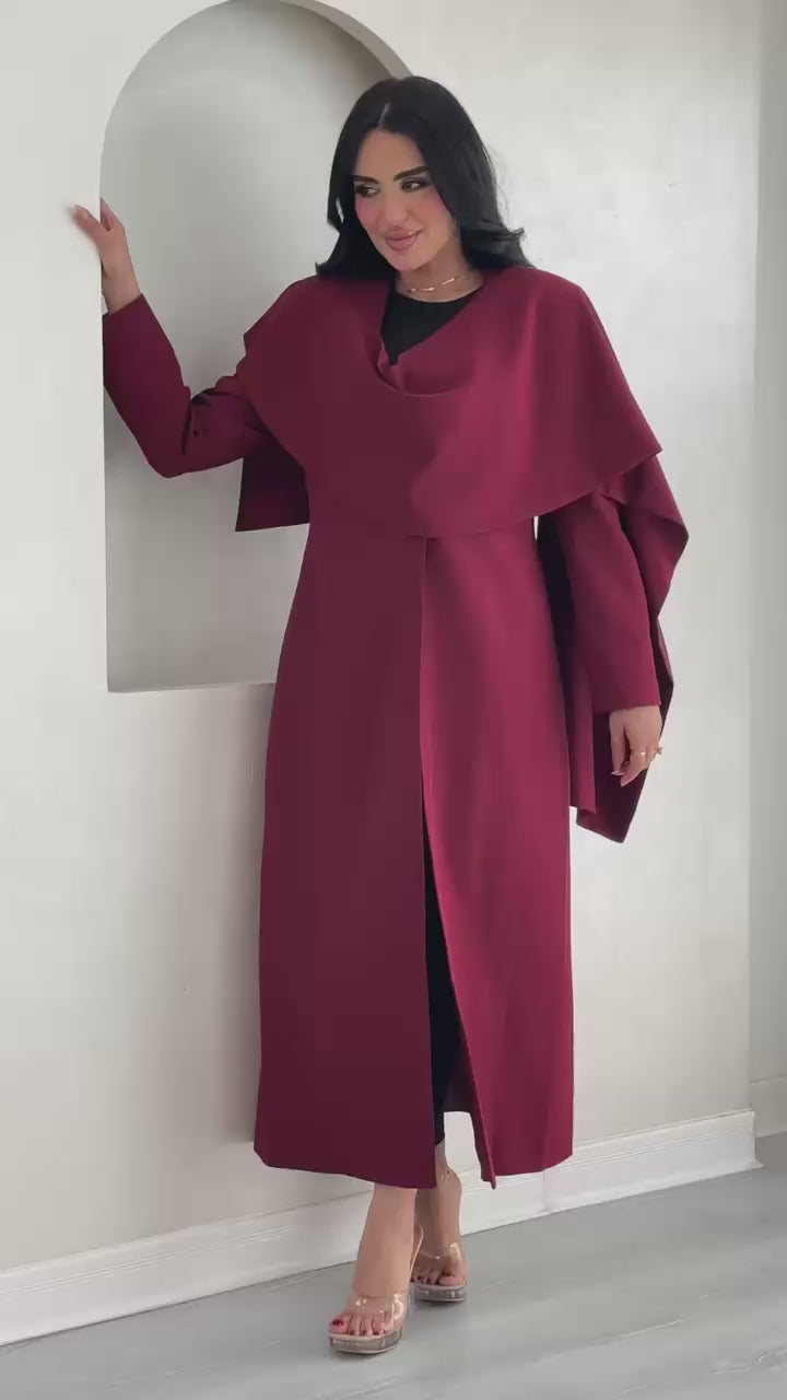 التصميم هو جاكيت أو معطف طويل يتميز بقطعة قماش علوية منسدلة بشكل كاب على الأكتاف، مما يضفي حجماً وشكلاً درامياً. القصة مستقيمة ومحددة عند الخصر. يتميز بياقة كلاسيكية عالية. الخامة مصنوعة من نسيج عالي الجودة وذو قوام متماسك، يضمن مظهراً احترافياً وثابتاً. القصةمصممة بعناية فائقة لتوفير مظهر أنيق يجمع بين الموضة والعملية، وتُعد إضافة ضرورية تعكس اختياراتك الراقية والفريدة، ومناسبة للمناسبات الرسمية والاحتفالية.