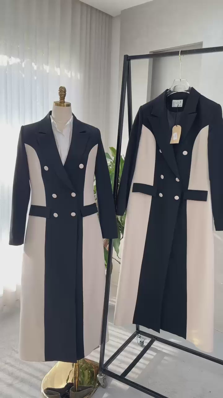 اللباس عبارة عن عباءة طويلة ذات تصميم أنيق يجمع بين الطابع العصري والكلاسيكي. تتكون من لوحات رأسية متباينة تمتد على الجانبين، بينما الجزء الأوسط يأتي بلون مختلف، مما يخلق تبايناً بصرياً جذاباً ويبرز القوام الطولي للجسم.
