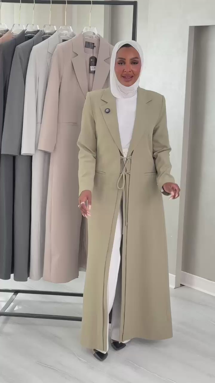 التصميم هو معطف طويل وقصة محددة عند الصدر والخصر، ثم ينسدل ليصبح أوسع من الأسفل (A-Line)، مما يمنح مظهراً أنثوياً مميزاً. يتميز بياقة كلاسيكية واسعة وأزرار أمامية للإغلاق. الخامة مصنوعة من نسيج عالي الجودة وذو قوام متماسك، يضمن مظهراً احترافياً وثابتاً. القصةمصممة لتكون قطعة علوية (Layering piece) فاخرة، وتُعد إضافة ضرورية تعكس اختياراتك الراقية والفريدة، ومناسبة للارتداء كمعطف في المناسبات الرسمية.