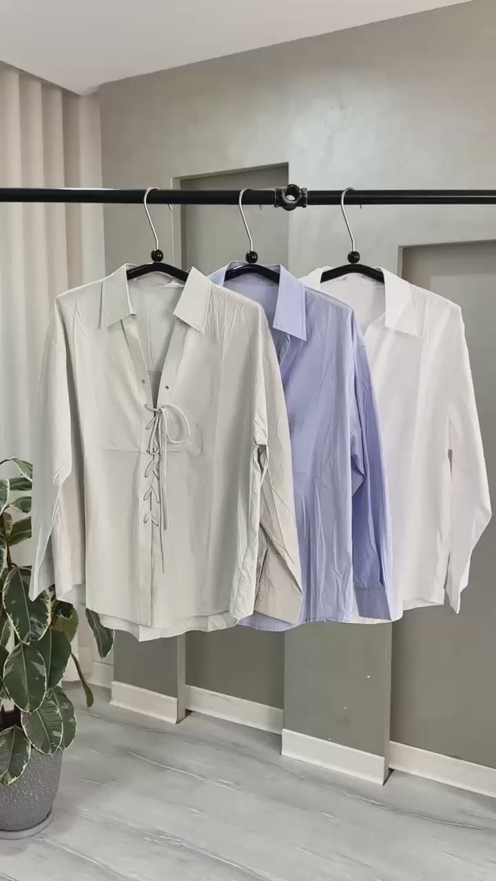 اللباس عبارة عن قميص بأكمام طويلة، مصنوع من قماش خفيف وناعم، ويتميز بياقة كلاسيكية مطوية. التصميم الأمامي مزود بفتحة تربط بواسطة خيوط تمر عبر حلقات معدنية، ما يمنح القطعة طابعاً زخرفياً قابلاً للتعديل حسب الرغبة.