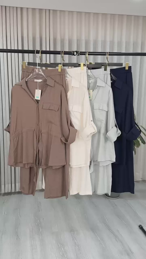 تميّزي بإطلالة أنثوية ناعمة مع هذا الطقم الراقي المكون من قميص بأكمام قصيرة وتنورة طويلة، مزين بلمسات يدوية أنيقة وزخارف على شكل ورود بارزة. التصميم يأتي بخطوط طولية أنيقة وتفاصيل معدنية راقية على الياقة وجيوب التنورة، ليمنحك مظهراً عصرياً وراقياً مثالي للإطلالات اليومية والمناسبات الخفيفة.