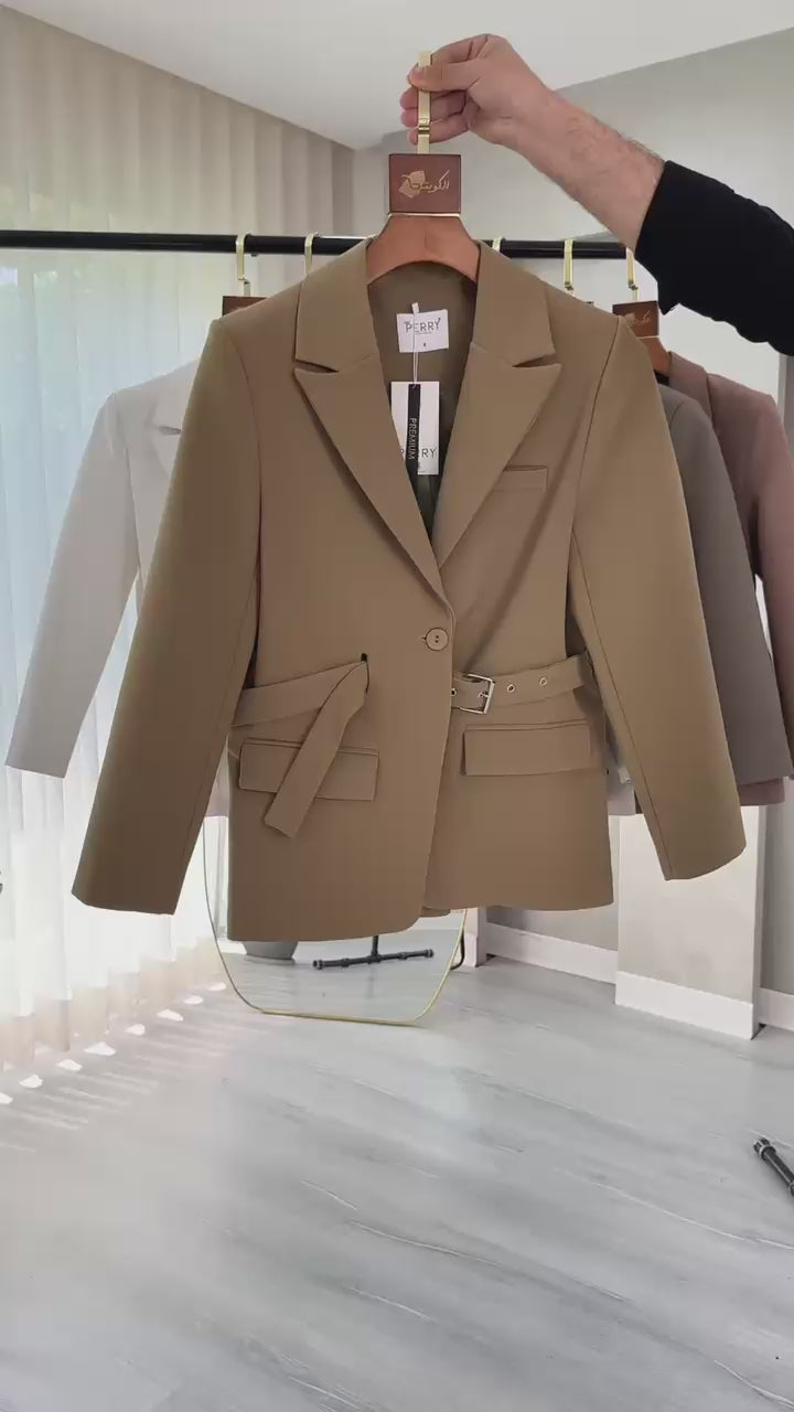 - **جاكيت رسمي مخصّر**: يتميز بقَصّة دقيقة تُبرز الخصر من خلال حزام خارجي بنفس القماش، مع ياقة كلاسيكية مفتوحة وزر أمامي للإغلاق. يحتوي على جيوب بغطاء تضيف لمسة عملية وأناقة متوازنة.