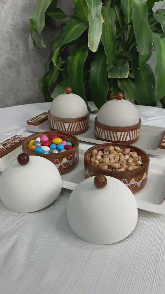 و مكون من صينية مستطيلة و بها يد خشب وهى الركيزة التى تحمل الاوعية و اثنين وعاء دائرية من الخشب البني اللون و غطاء من الاستاليس استيل المطلي