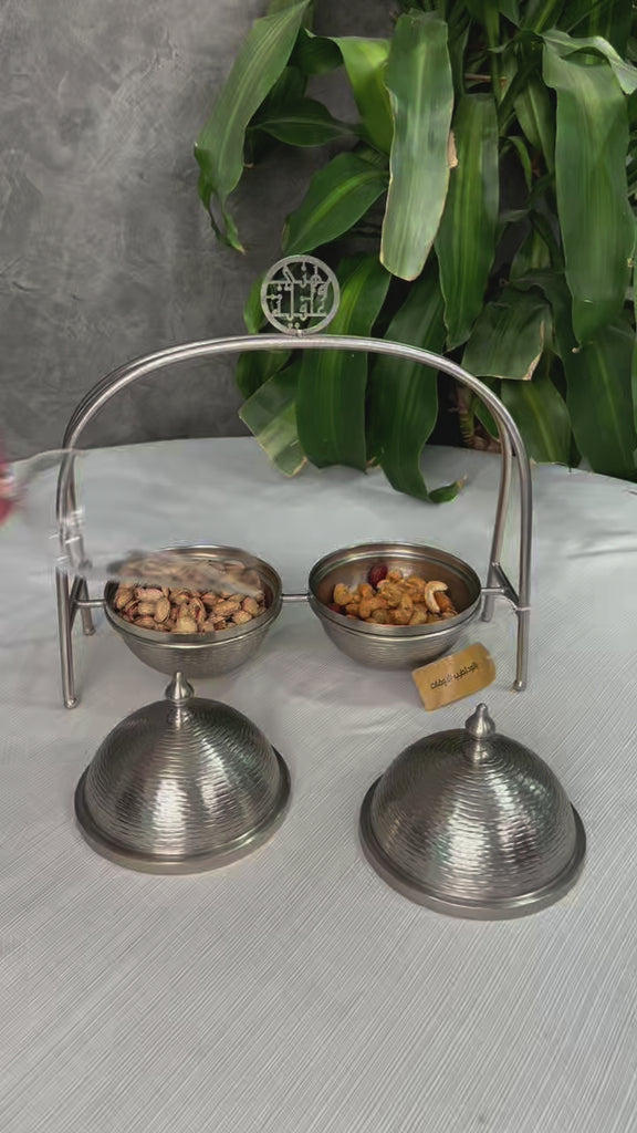 وعاء التمر هذا يبدو أنه قطعة أنيقة وعملية في نفس الوقت يتكون الوعاء من قاعدة عريضة تحمل وعائين كروي الشكل الأوعية الكروية مزودة بأغطية مما يساعد على الحفاظ على التمر طازجًا تصميم الوعاء يعكس طابعًا تقليديًا وعربيًا