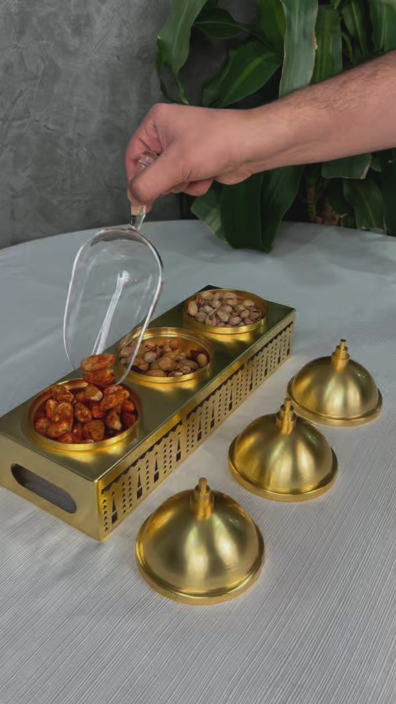 لتصميم أنيق ومزخرف، حيث تحتوي الصينية على ثلاثة أوعية معدنية مخروطية الشكل مزودة بأغطية، وهي مرتبة على قاعدة ذات نقوش جمالية تعكس الطابع التقليدي مع لمسة عصرية. المنتج مناسب لتقديم الضيافة أو تخزين التوابل والمكسرات بشكل منظم وجميل