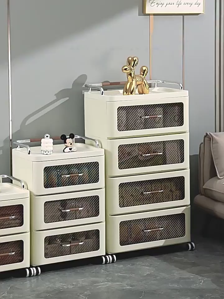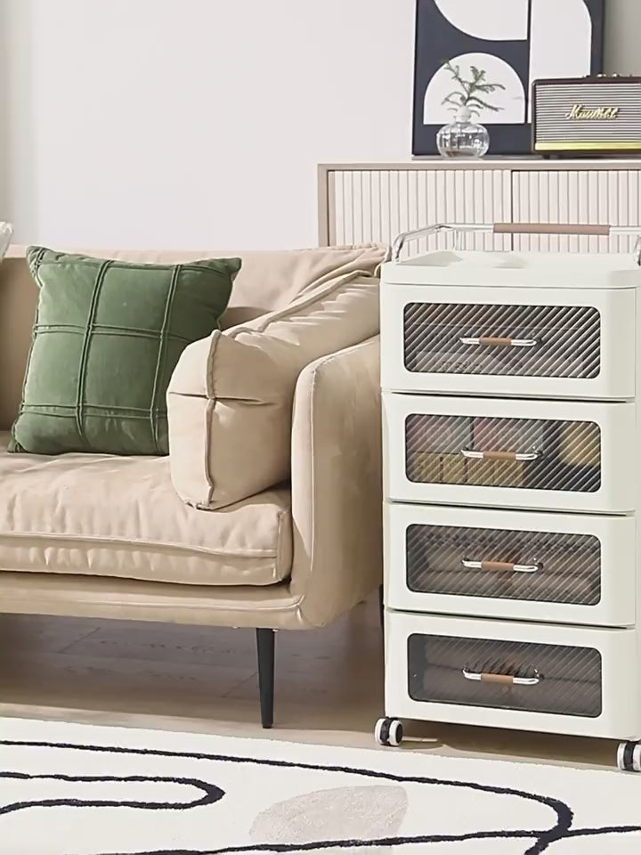 طاولة جانبية بلاستيكية حديثة باللون البني مع أبواب شفافة ودرج بلاستيكي مرن