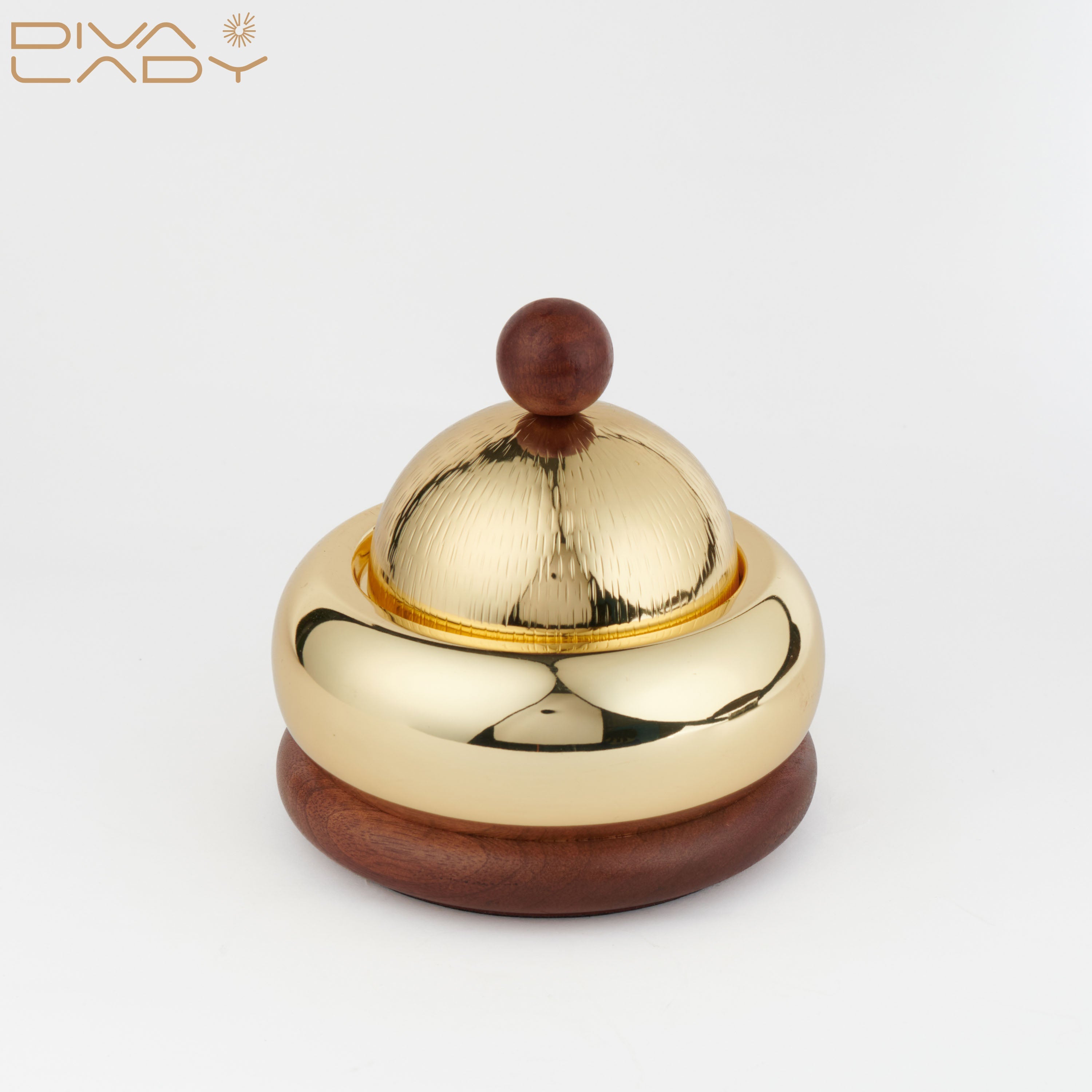 تمريّة بتصميم أنيق وعصري تجمع بين الفخامة والبساطة. مصنوعة من قاعدة خشبية متينة، يعلوها غطاء ذهبي لامع على شكل قبّة، مع مقبض كروي خشبي يضيف لمسة دافئة. مثالية لتقديم التمر بأسلوب راقٍ يليق بالضيافة العربية الأصيلة.