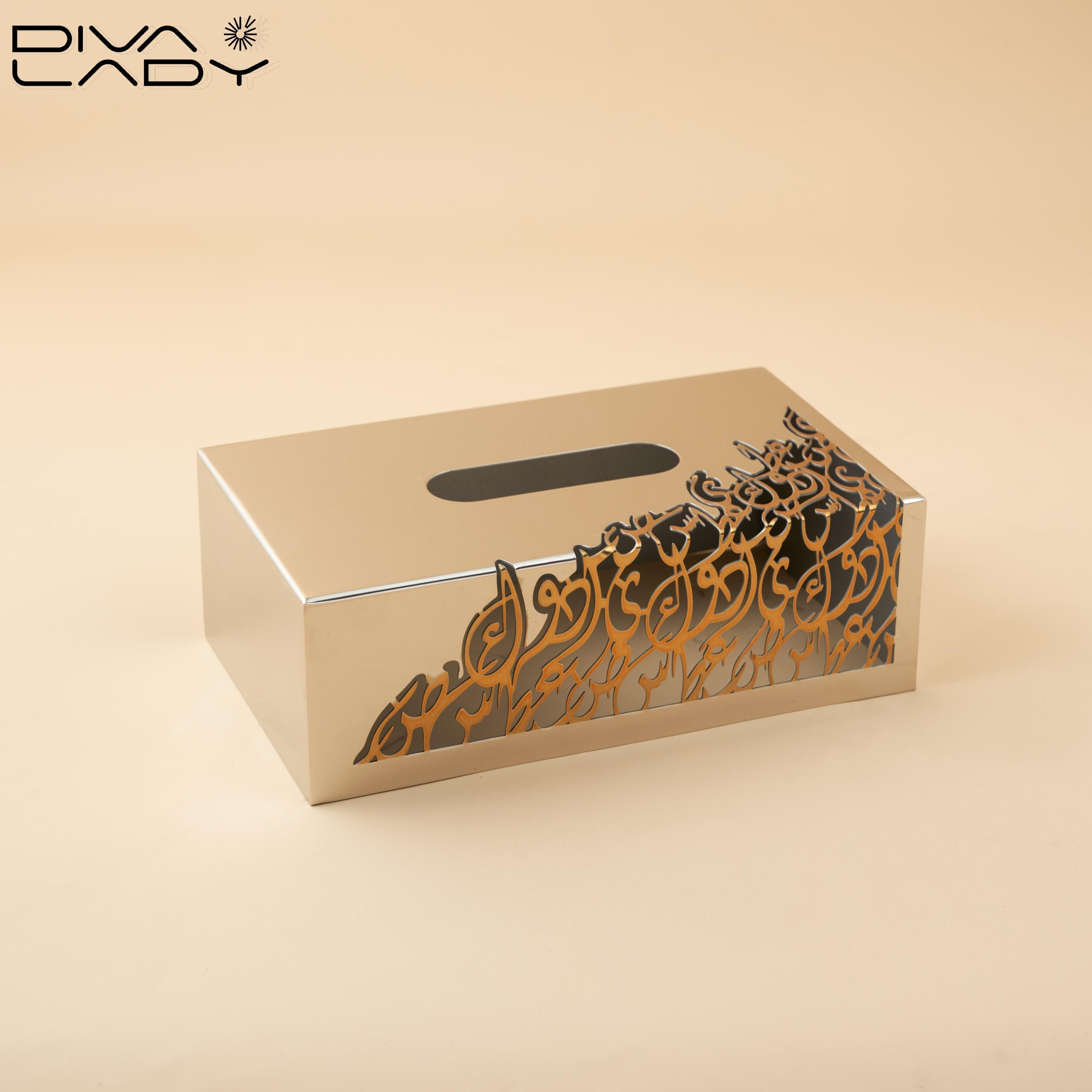 علبة مناديل أنيقة مصنوعة من الاستانلس ستيل تتميز العلبة بتصميم عصرى و راقى حيث تم نقش زخارف كلاسيكية على سطحها الخارجى الزخارف تتكون من خطوط عربية متداخلة بشكل جميل مما يعطيها مظهرا فنيا جذابا و اللون الاساسى للعلبة هو الفضى اللامع بينما الزخارف منقوشة باللون الذهبى مما يعطيها تباينا لافتا للنظر و تستخدم العلبة لحفظ المناديل فى المنزل و المكتب و هى تعد قطعة ديكور مميزة تضيف لمسة من الفخامة و الاناقة الى اى مكان توضع فيه