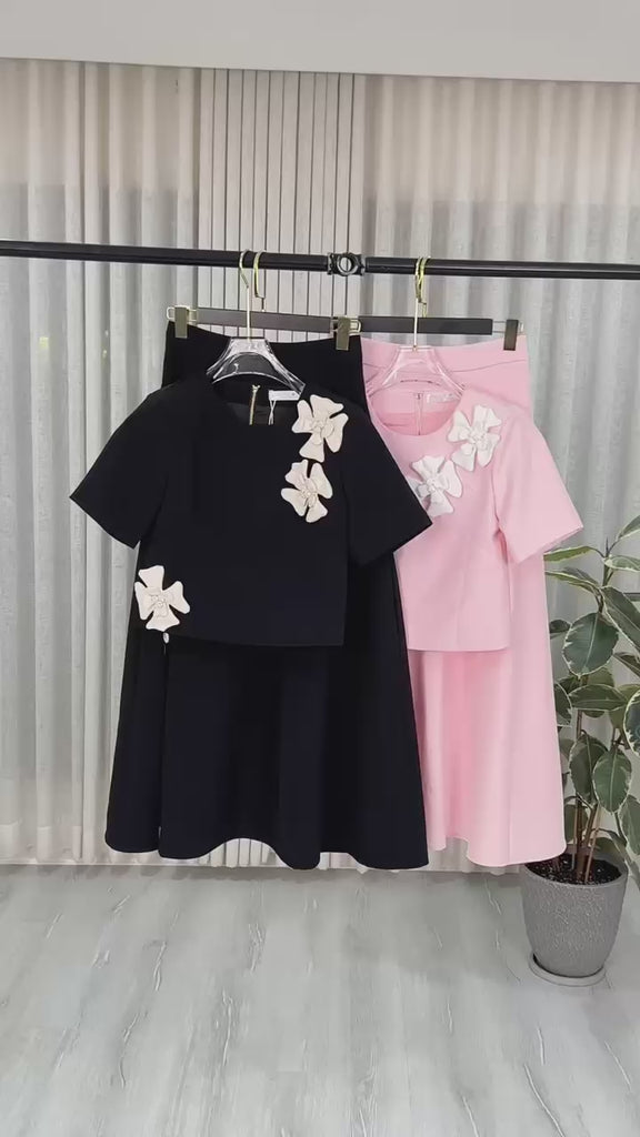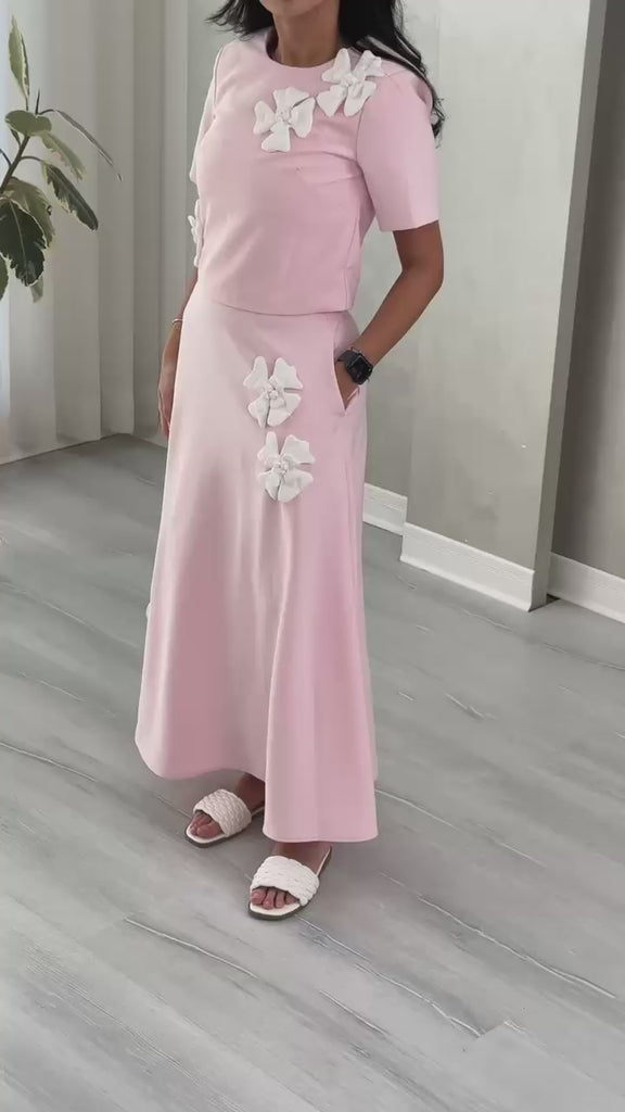 تميّزي بإطلالة أنثوية ناعمة مع هذا الطقم الراقي المكون من قميص بأكمام قصيرة وتنورة طويلة، مزين بلمسات يدوية أنيقة وزخارف على شكل ورود بارزة. التصميم يأتي بخطوط طولية أنيقة وتفاصيل معدنية راقية على الياقة وجيوب التنورة، ليمنحك مظهراً عصرياً وراقياً مثالي للإطلالات اليومية والمناسبات الخفيفة.