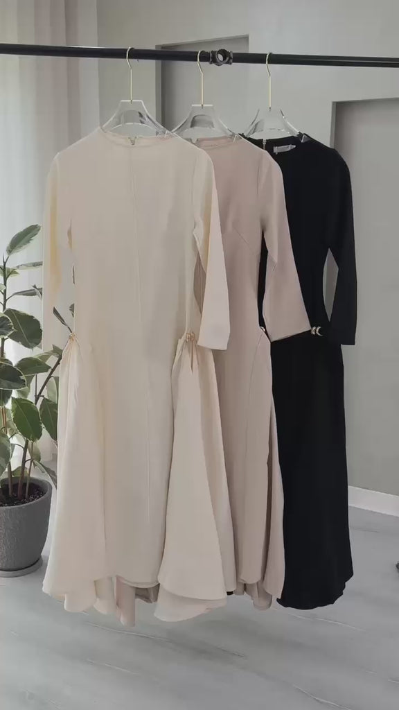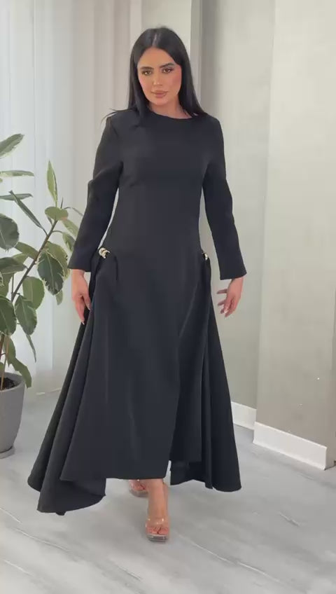 فستان أنيق بتصميم كلاسيكي عصري، يتميز بقصة واسعة وانسيابية تضيف لمسة من الرقي والأنوثة. مزود بأكمام طويلة لمظهر أنثوي ناعم، مع تفاصيل طيات عمودية تمنح التصميم حركة وجاذبية. مثالي للمناسبات الخاصة والسهرات، ويجمع بين البساطة والفخامة في آن واحد.