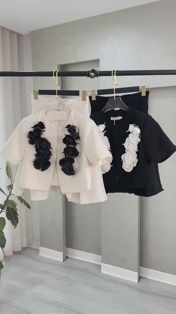 طقم أنيق يتكون من بلوزة قصيرة بأكمام متوسطة الطول وتنورة واسعة بتفاصيل كسرات راقية. يتميز التصميم بلمسات ثلاثية الأبعاد على البلوزة تضيف فخامة فريدة، مع أزرار بارزة على التنورة تعزز من الطابع العصري. مثالي للمناسبات الرسمية والإطلالات المميزة، ويجمع بين الأناقة والتفاصيل الفريدة بإطلالة متكاملة.