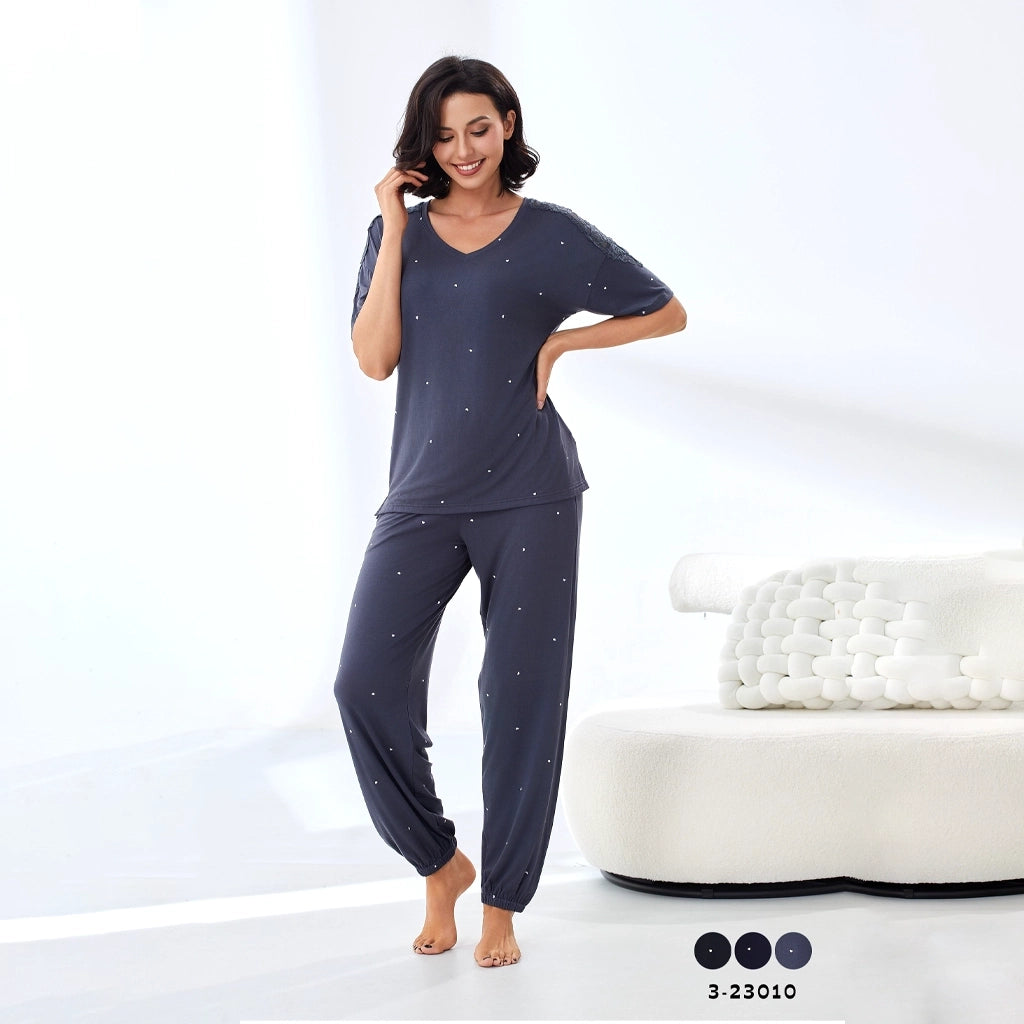 انغمسي في تجربة نوم هانئة وعميقة بالحصول على الطقم الرائع هذا. مصنوع بخامة عالية الجودة يوفّر مستويات قصوى من الراحة طوال الليل، ويتميز بتصميم أنيق يجمع بين الموضة والعملية، ويُعد إضافة ضرورية إلى خزانتك الأساسية تعكس اختياراتك الراقية والفريدة.