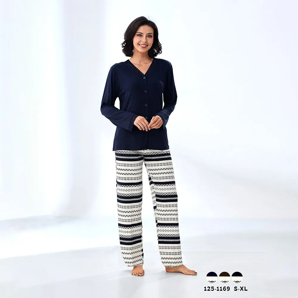 أضيفي هذا الطقم الرائع إلى ملابسك المنزلية، مكون من بلوزة وبنطلون بيجاما، ومزين بطبعات جميلة