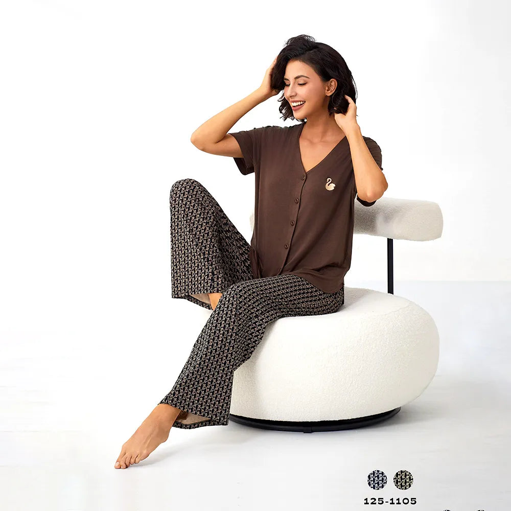 أضيفي هذا الطقم الرائع إلى ملابسك المنزلية، مكون من بلوزة وبنطلون بيجاما، ومزين بطبعات جميلة
