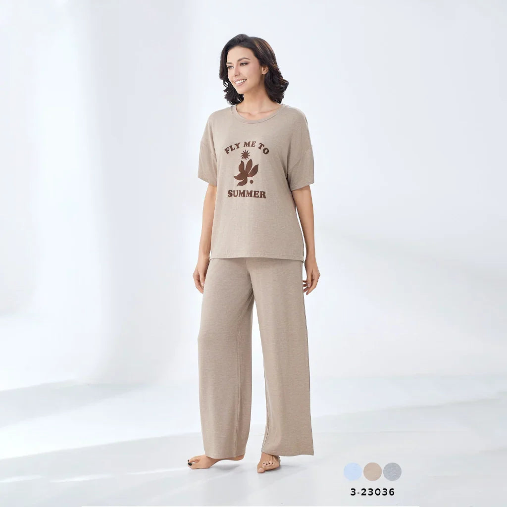 أضيفي هذا الطقم الرائع إلى ملابسك المنزلية، مكون من بلوزة وبنطلون بيجاما، ومزين بطبعات جميلة