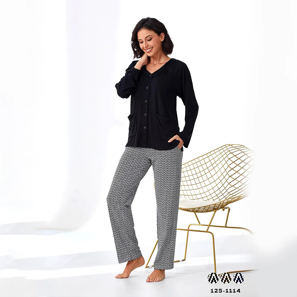 أضيفي هذا الطقم الرائع إلى ملابسك المنزلية، مكون من بلوزة وبنطلون بيجاما، ومزين بطبعات جميلة