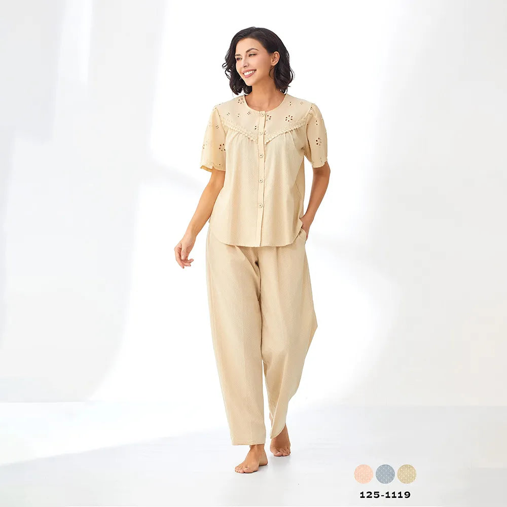 أضيفي هذا الطقم الرائع إلى ملابسك المنزلية، مكون من بلوزة وبنطلون بيجاما، ومزين بطبعات جميلة