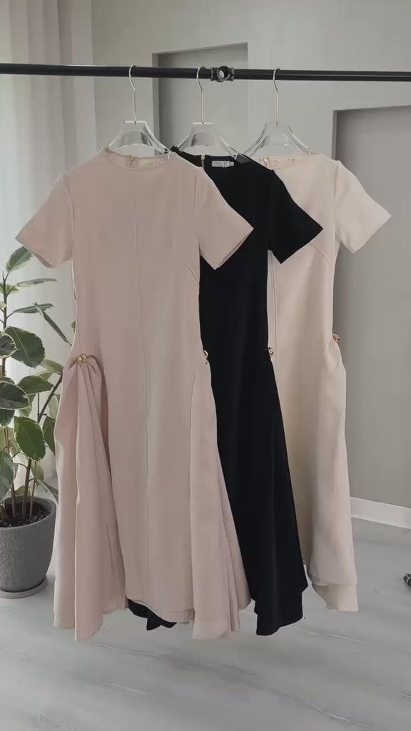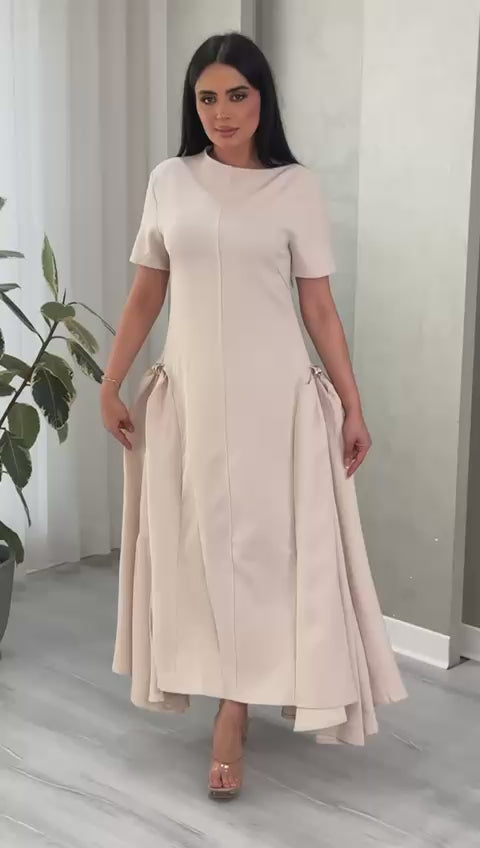 فستان أنيق بتصميم كلاسيكي عصري، يتميز بقصة واسعة وانسيابية تضيف لمسة من الرقي والأنوثة. مزود بأكمام قصيرة لمظهر أنثوي ناعم، مع تفاصيل طيات عمودية تمنح التصميم حركة وجاذبية. مثالي للمناسبات الخاصة والسهرات، ويجمع بين البساطة والفخامة في آن واحد.