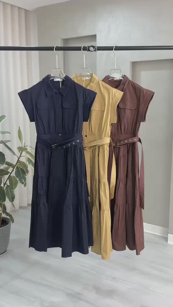 فستان مميز بتفاصيل عملية وأناقة بسيطة، يتميز بأزرار أمامية وجيوب تضيف لمسة عصرية للتصميم. الطيات المتدرجة تمنح القطعة حركة جميلة، ويُرفق بحزام من نفس القماش لإطلالة متناسقة ومرتبة. مناسب لمناسبات متعددة بفضل تصميمه العملي والأنيق في آنٍ واحد