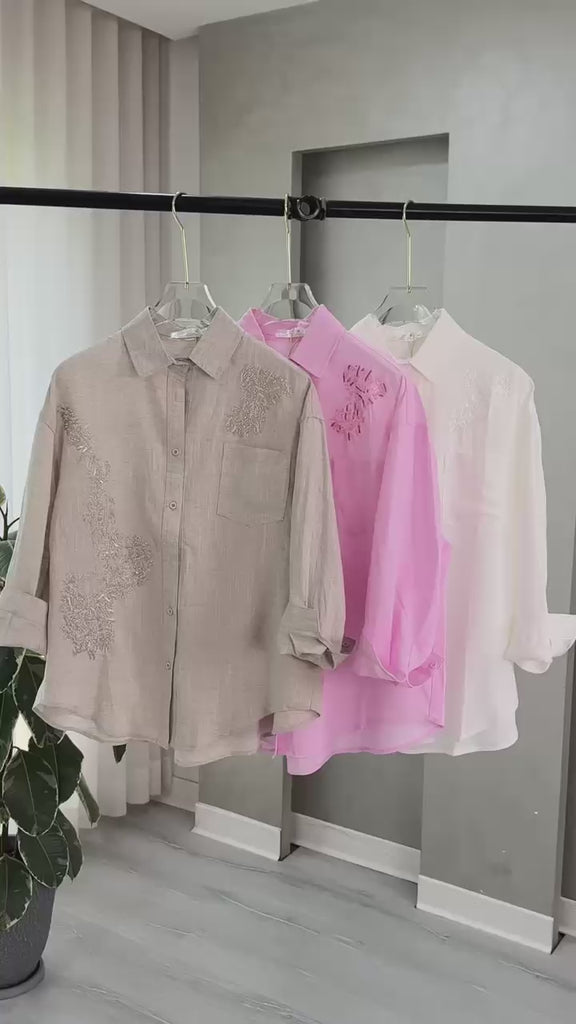 تميزي بإطلالة أنثوية ناعمة مع هذا القميص الأنيق المصمم بتطريز يدوي فاخر وتفاصيل خرز لامعة تضيف لمسة من الرقي. مثالي للمناسبات الكاجوال والرسمية.
