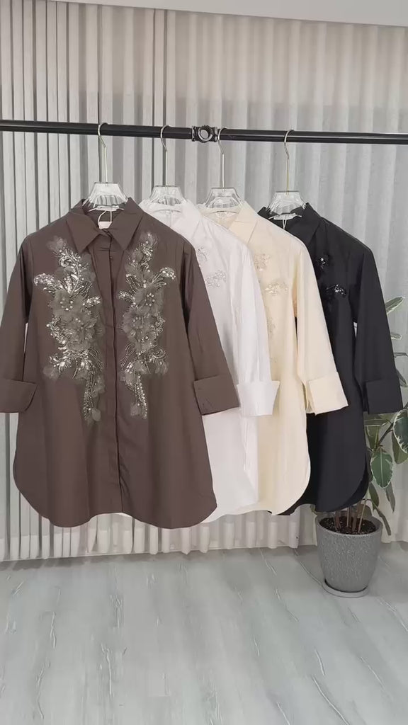 تميّزي بإطلالة أنثوية ناعمة مع هذا الطقم الراقي المكون من قميص بأكمام قصيرة وتنورة طويلة، مزين بلمسات يدوية أنيقة وزخارف على شكل ورود بارزة. التصميم يأتي بخطوط طولية أنيقة وتفاصيل معدنية راقية على الياقة وجيوب التنورة، ليمنحك مظهراً عصرياً وراقياً مثالي للإطلالات اليومية والمناسبات الخفيفة.