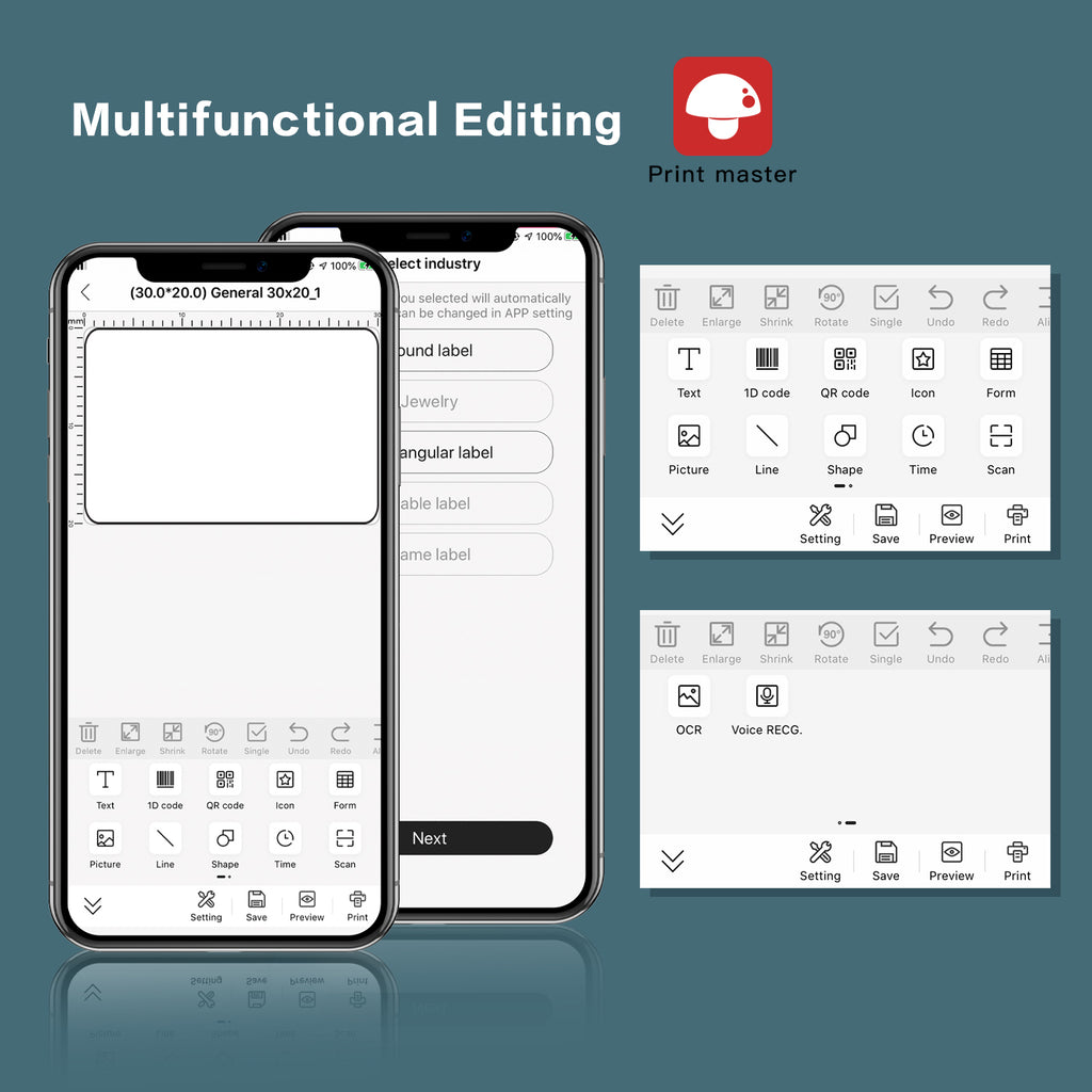 Image, barcode, QRcode, scan printing and other functions can be realized in 【Print Master】APP.