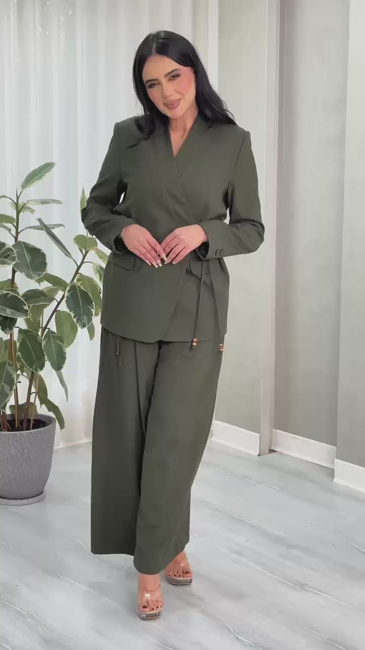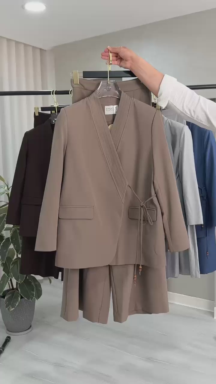 1. الجاكيت: بقصة "ملفوفة" (Wrap-style) أنيقة مع فتحة صدر على شكل حرف V وأكمام طويلة، مع تفاصيل أزرار أو حزام جانبي يحدد الخصر بشكل أنثوي.