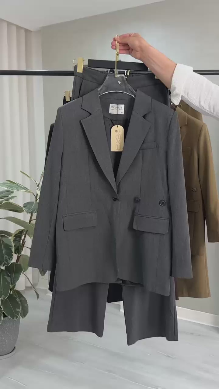 الجاكيت: بقصة رسمية كلاسيكية ذات أكتاف محددة، ويتميز بياقة مسننة وأزرار أمامية أنيقة، مع تفاصيل جيوب جانبية تضفي لمسة احترافية.