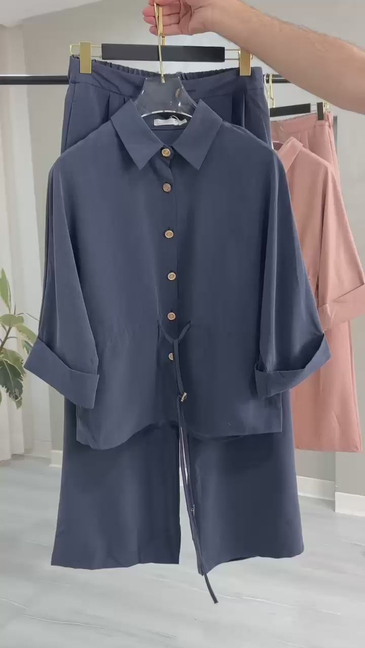 - **القطعة العلوية**: قميص بأكمام طويلة مزوّد بياقة رسمية وأزرار أمامية تمتد على طول الصدر. الأكمام تنتهي بأساور مرتبة، ويحتوي الخصر على رباط قابل للشد يمنح القميص شكلًا أكثر تحديدًا ويضفي توازنًا بين الراحة والتنسيق.