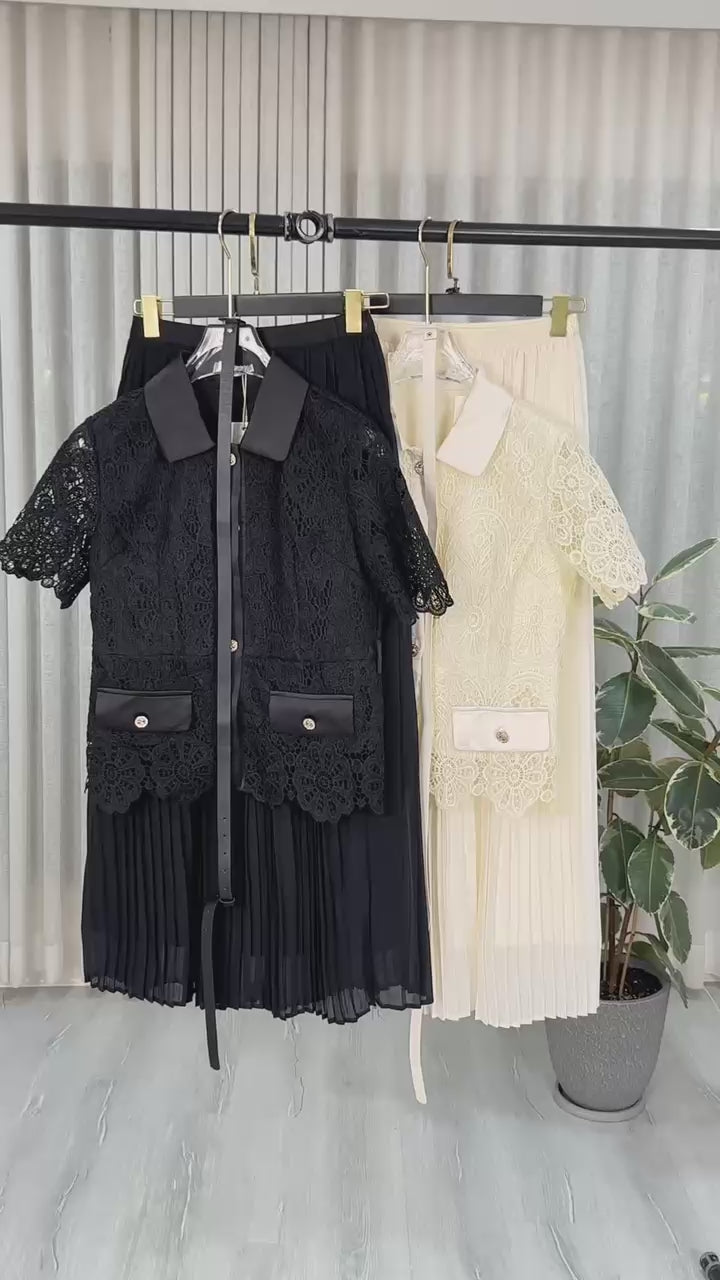 تميّزي بإطلالة أنثوية ناعمة مع هذا الطقم الراقي المكون من قميص بأكمام قصيرة وتنورة طويلة، مزين بلمسات يدوية أنيقة وزخارف على شكل ورود بارزة. التصميم يأتي بخطوط طولية أنيقة وتفاصيل معدنية راقية على الياقة وجيوب التنورة، ليمنحك مظهراً عصرياً وراقياً مثالي للإطلالات اليومية والمناسبات الخفيفة.
