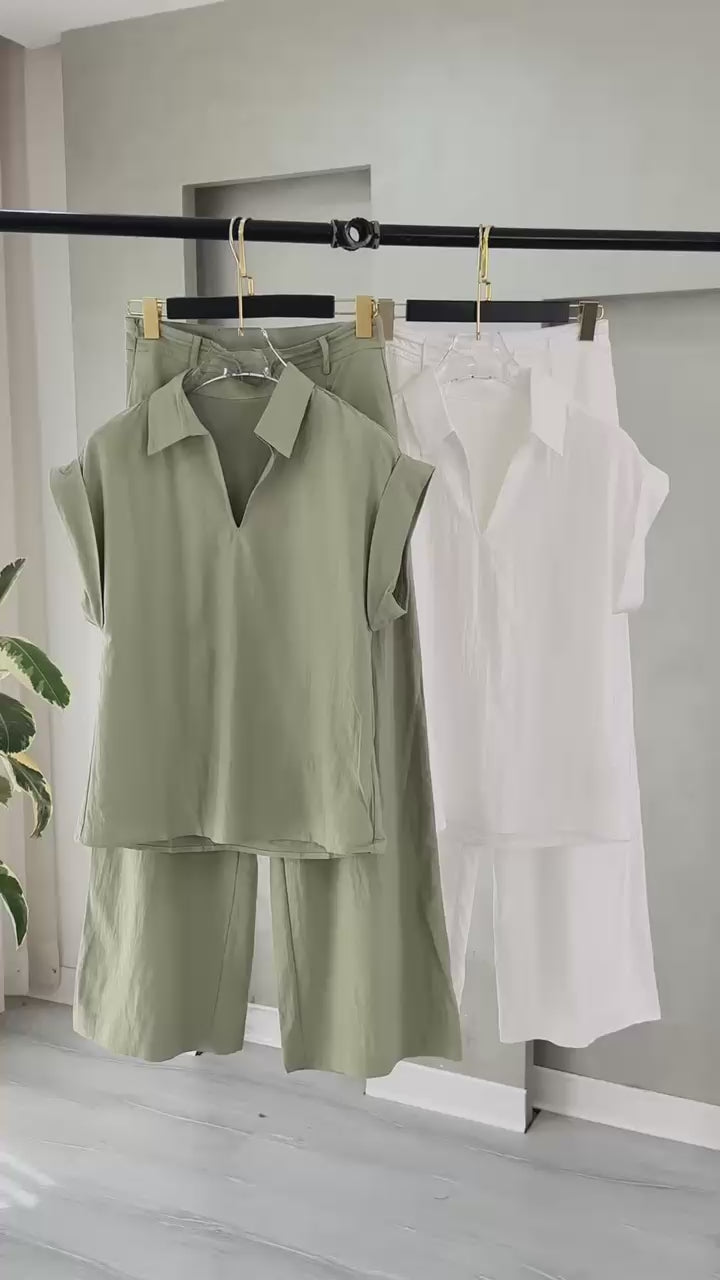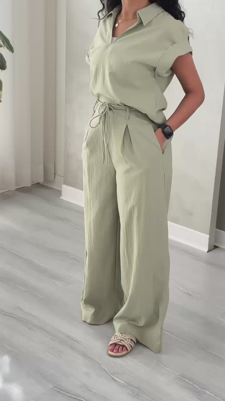 اللباس يتكوّن من بلوزة قصيرة الأكمام ذات ياقة كلاسيكية، تُغلق بأزرار أمامية، وتُربط عند الخصر بحزام قابل للتعديل. الأكمام مطوية بشكل أنيق، والبلوزة مدخلة داخل بنطال واسع عالي الخصر، مزوّد برباط عند الوسط لتحديد القوام. القماش يبدو خفيفاً ومرن الحركة، مما يمنح الإطلالة طابعاً عملياً ومريحاً مع لمسة من التناسق في التصميم.