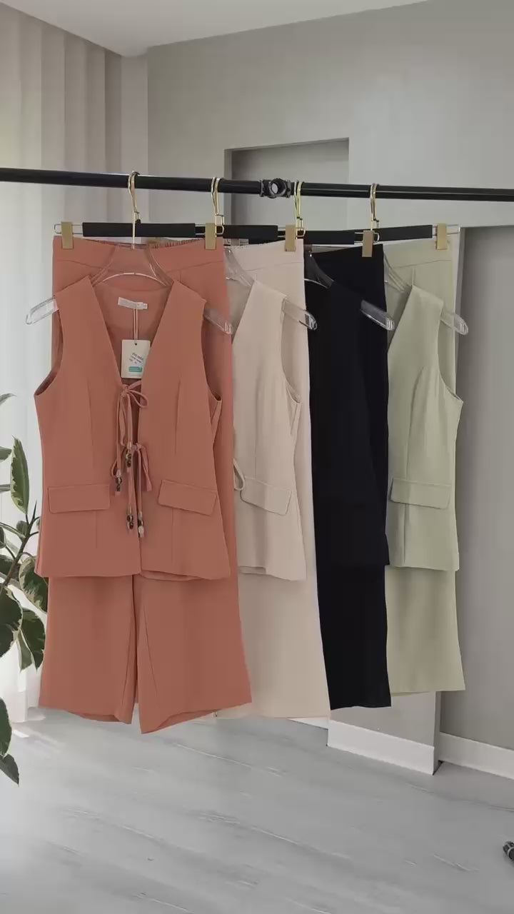 يتميز هذا الطقم بجودة تصنيع عالية لضمان أقصى مستويات الراحة والمتانة طوال اليوم. يتميز التصميم بلمسة عصرية راقية تلائم مختلف الأوقات والمناسبات، حيث ينساب القماش بخفة ليمنحك حرية الحركة. ويتكون الطقم من قطعتين متناسقتين: جاكيت بدون أكمام بياقة أنيقة وتفاصيل أزرار أمامية، وبنطال بقصة واسعة ومريحة بحزام خصر متطابق يضيف تحديداً سلساً وأنيقاً. إنه إضافة أساسية وضرورية لخزانتك تعكس ذوقك الرفيع والفريد.